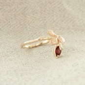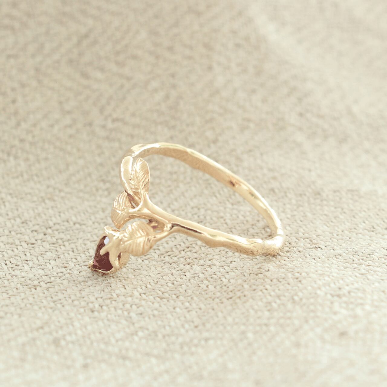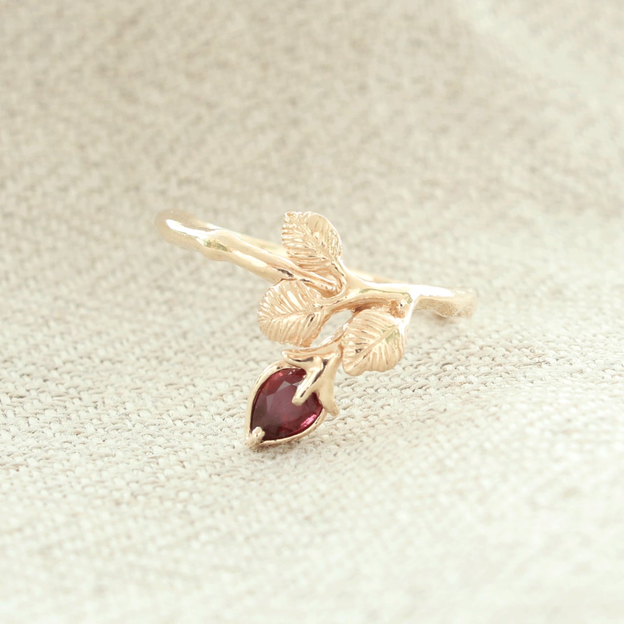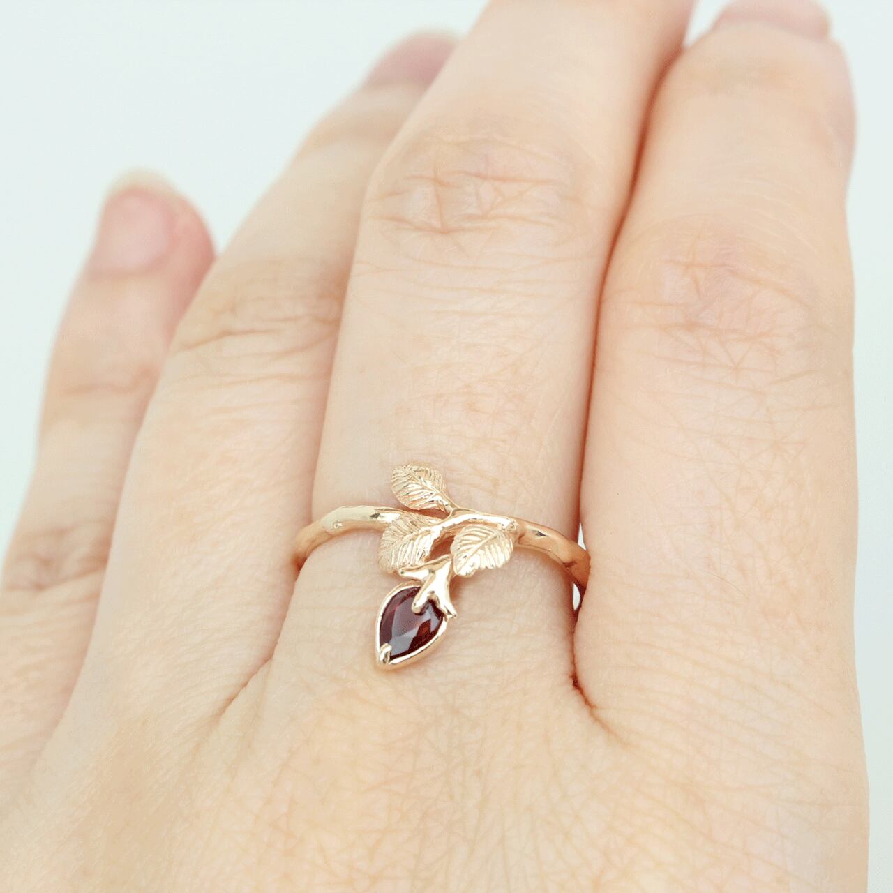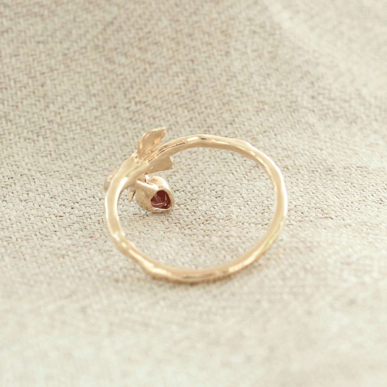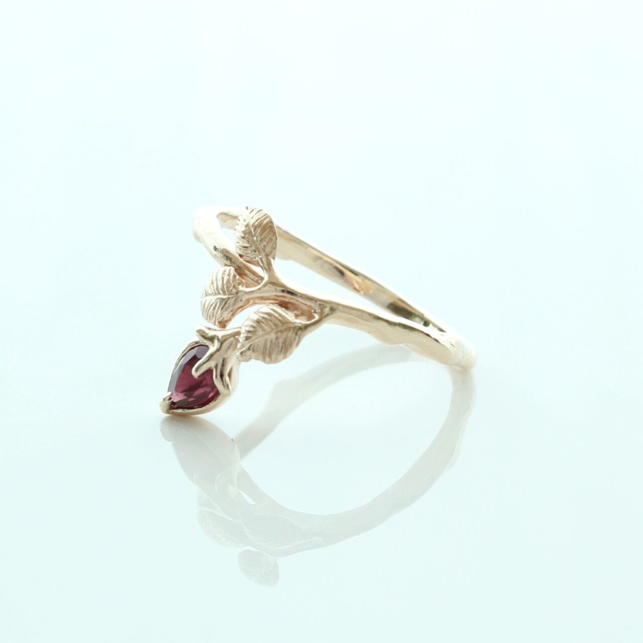 色味や形がいちごのようだったので、指に沿うように一粒のいちごに模したルビーを留めて、動きのあるデザインでお仕立てしました