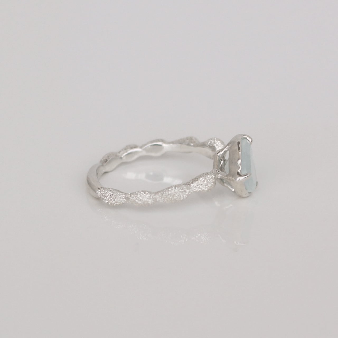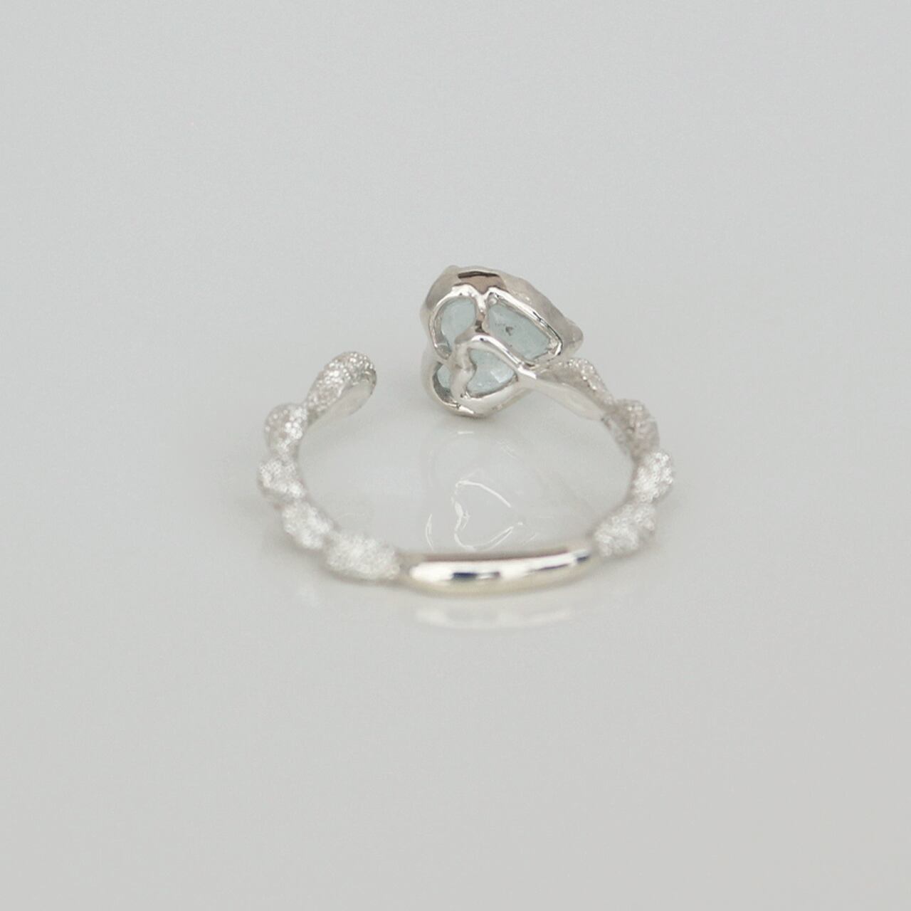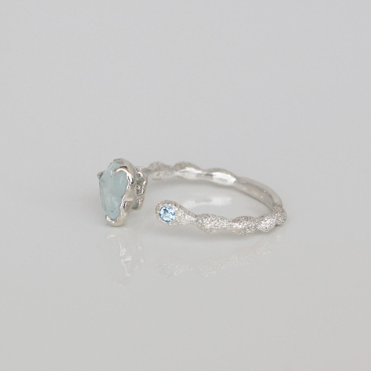 連なるしずくをイメージしたリングにダスト加工を施し、反対側にアクアマリンを一石留めています