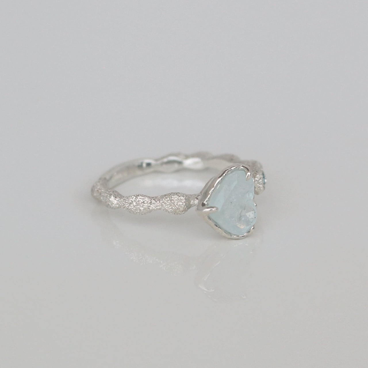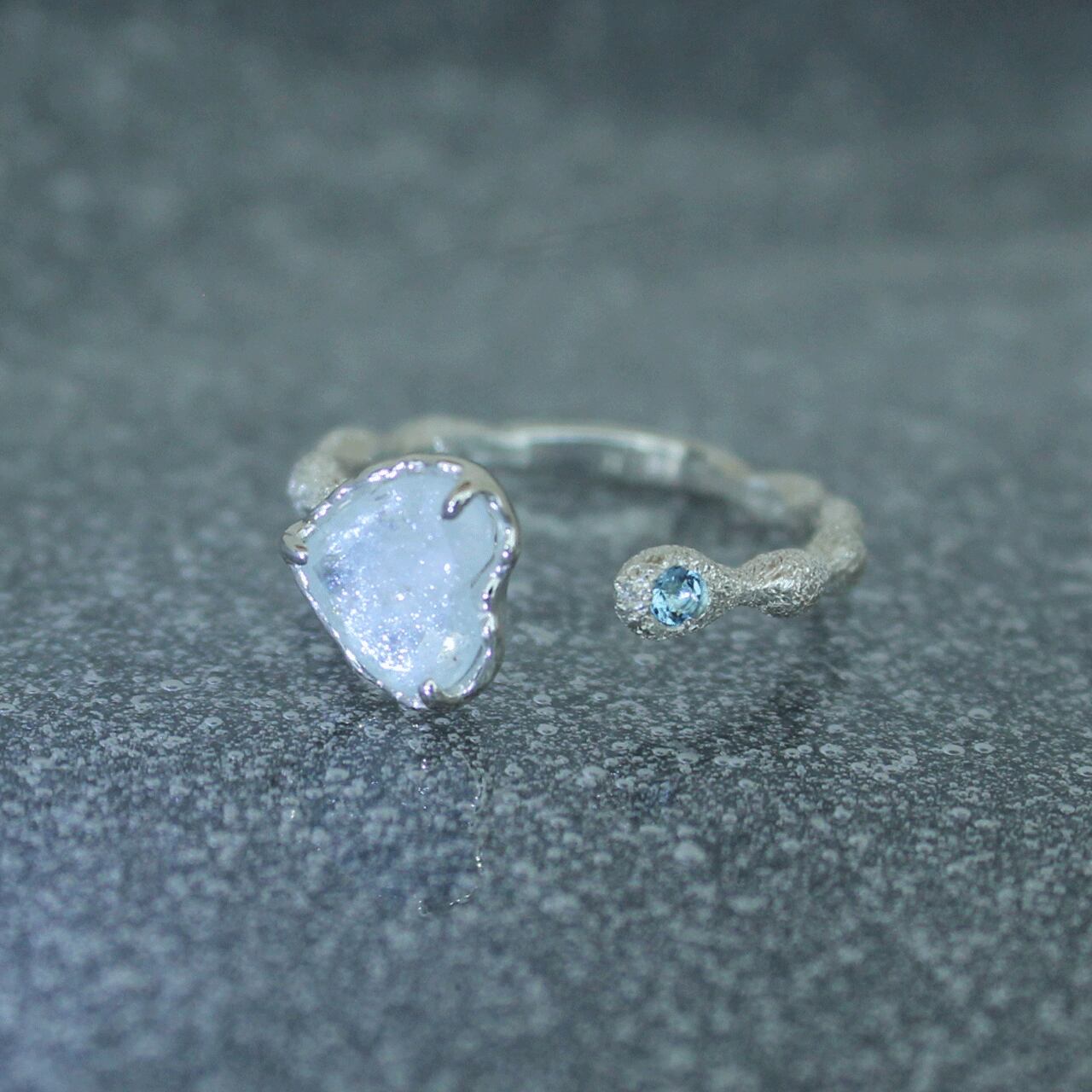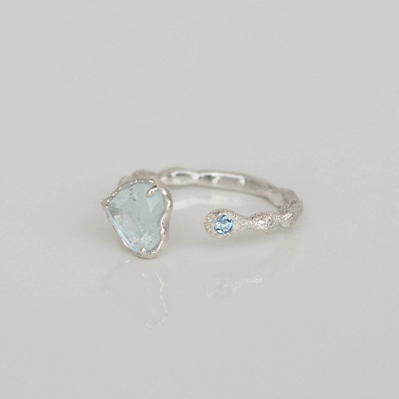 連なるしずくをイメージしたリングにダスト加工を施し、反対側にアクアマリンを一石留めています