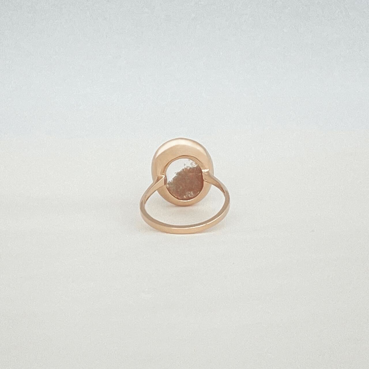 ピーチピンクからグレーベージュ色のもこもこな内包物が優しい印象の、カボションカットのガーデンクォーツ
