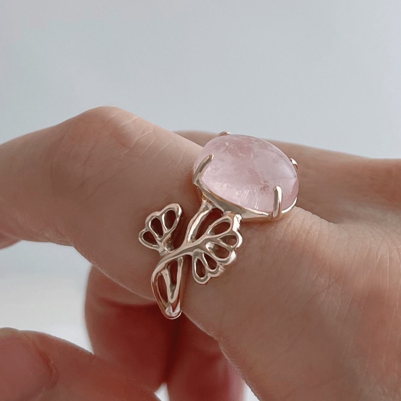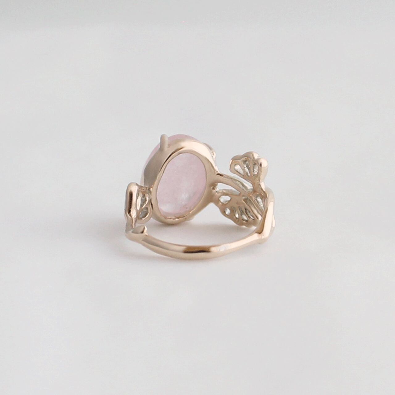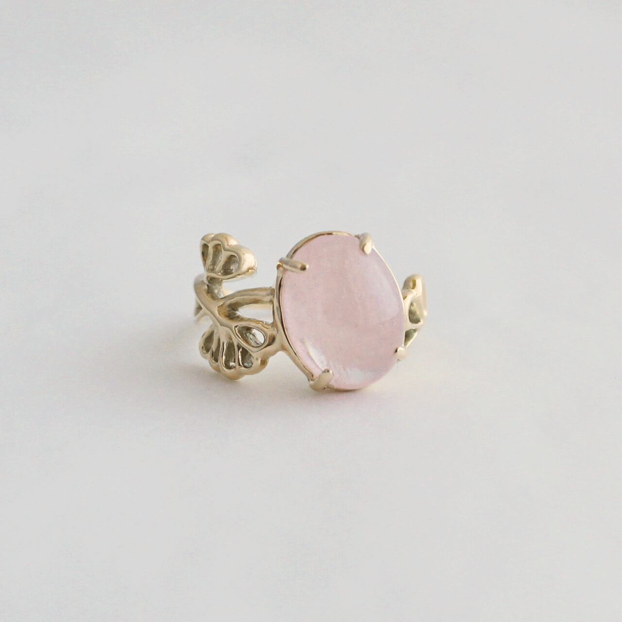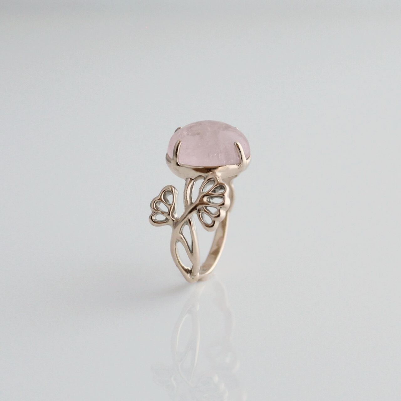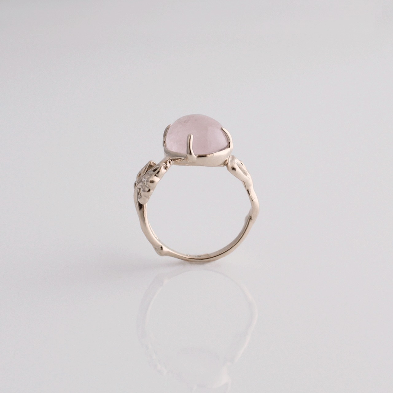 花の横顔をイメージしたガーランド模様のリングアームに、モルガナイトの花咲くリングです