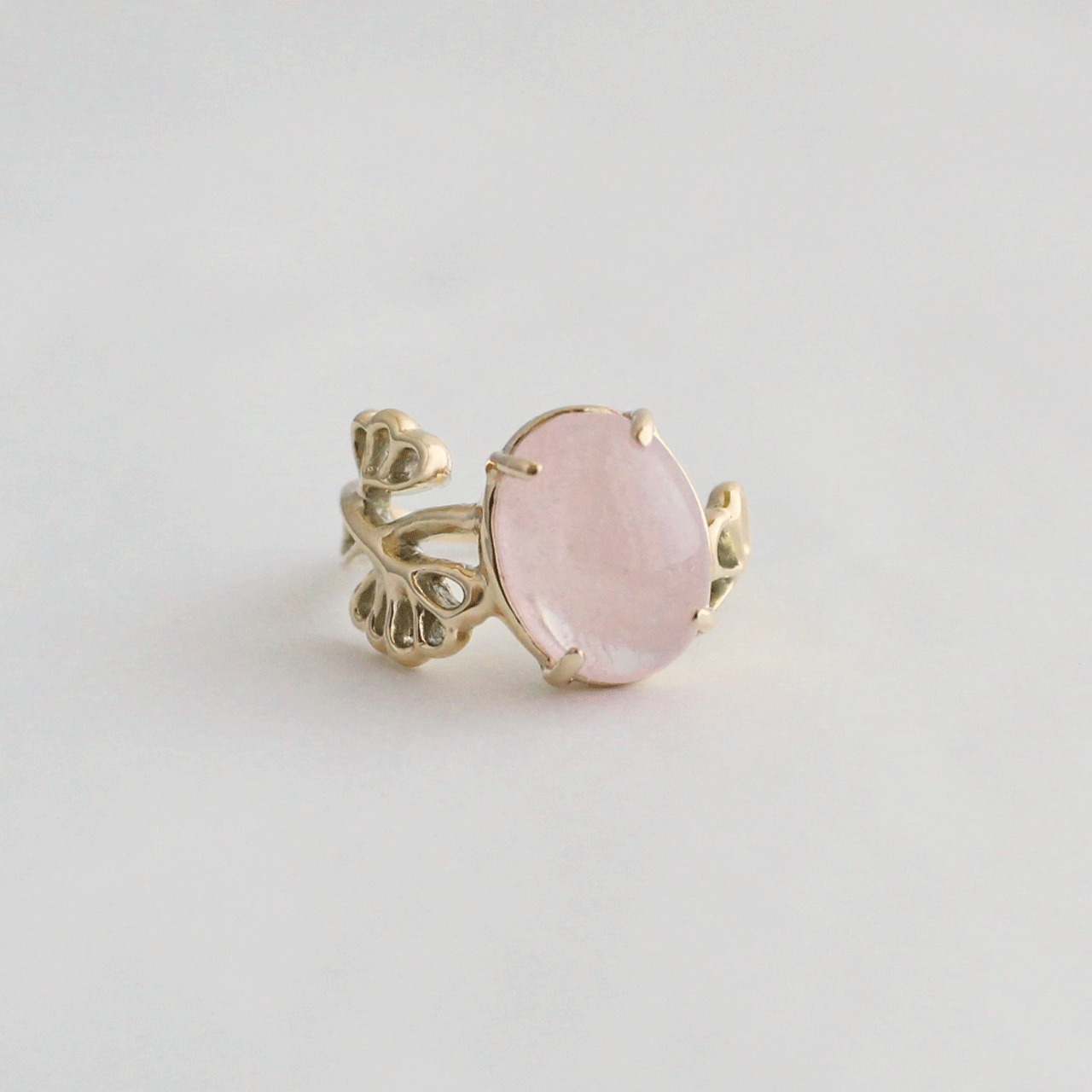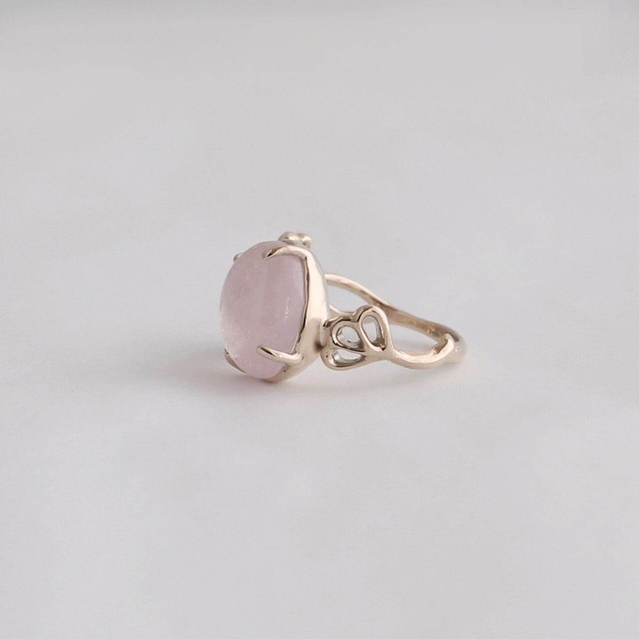 モルガナイトの淡いピンクと肌なじみのよいK10ゴールドでヌーディな印象