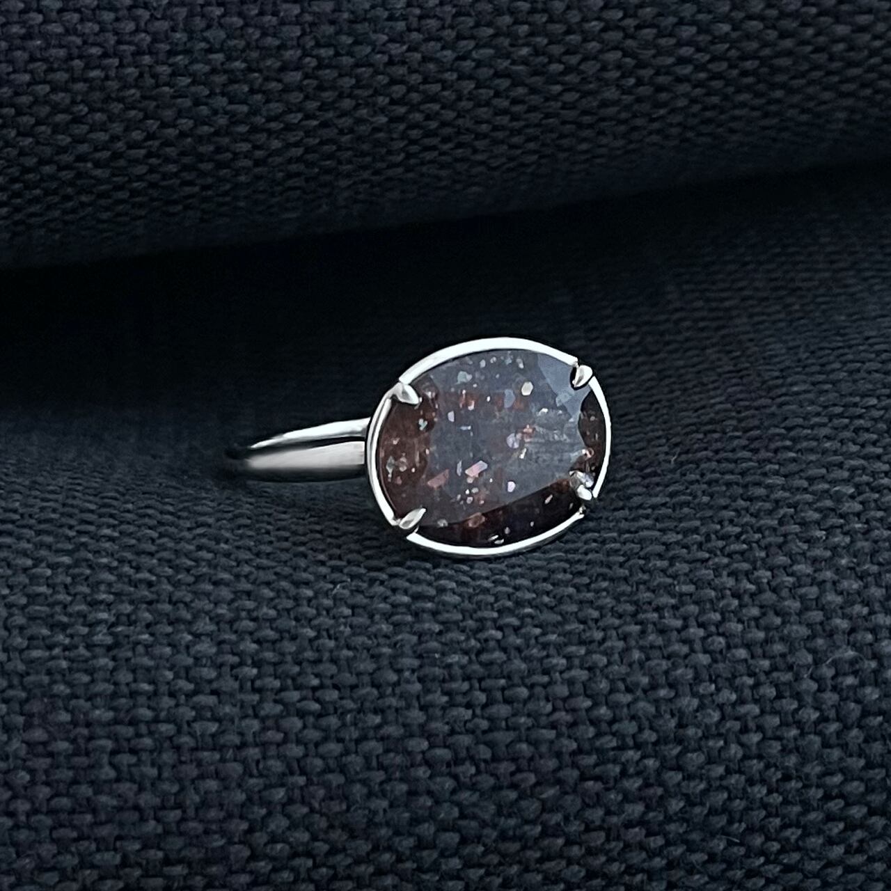 赤味を帯びた鉄系のインクルージョンに紙吹雪のように舞うヘマタイトが銀河の星のようで、いろいろな角度から眺めてしまう一粒です