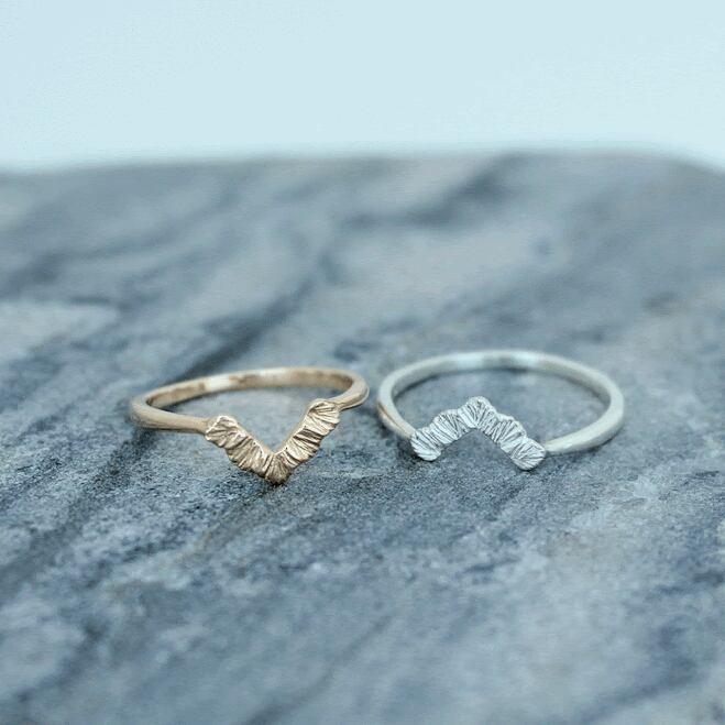 スキンジュエリーのように日常使いできるアイテムでもあり、モチーフをV字にしているので他の石付きのリングと重ねても収まりがよく、リングの上下もその日の気分で変えればまた違った雰囲気を楽しめるシンプルリングです